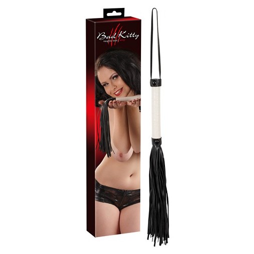 Črno-bel bič Bad Kitty dolžine 39 cm (brez ročaja) je narejen iz umetnega usnja ter se ponaša s poliuretanskim ročajem, ki med uporabo omogoča čvrst oprijem.