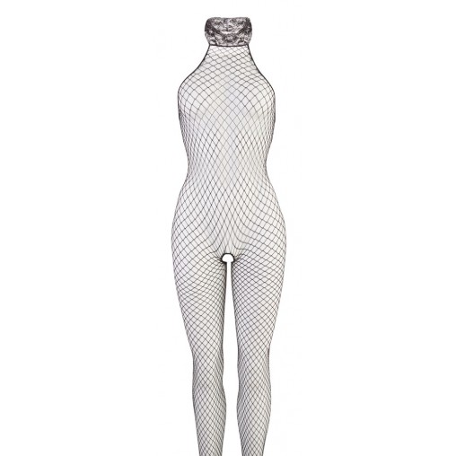 Zapeljiv mrežasti catsuit, odprt v razkoraku in s čipkastim ovratnikom.