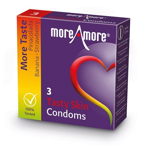 Vpeljite malce zabave v spalnico s kondomi, ki ne le dišijo odlično, ampak so tudi izjemno dobrega okusa. V paketku so 3 različni okusi: jagoda, banana in pina-cola. Pustite se zapeljati s temi okusi in ugotovite kateri je vam najljubši. Preizkusili boste lahko vse tri , saj se v enem paketku nahajajo vsi trije okusi, hkrati pa boste tako lahko vsakič znova z okusom presenetili tudi partnerja.
