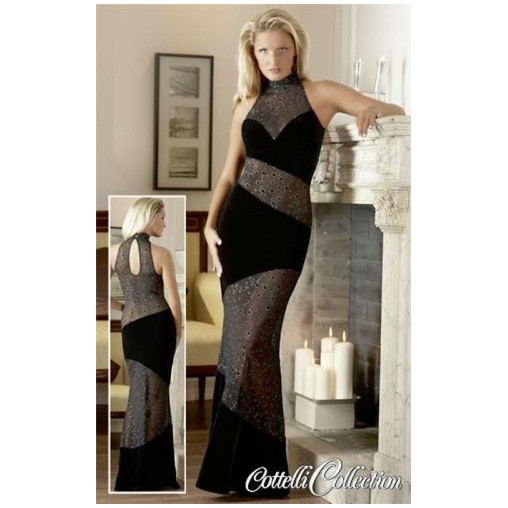 Čudovita dolga črna obleka s prosojnimi predeli in potiskom bleščečih krogov.