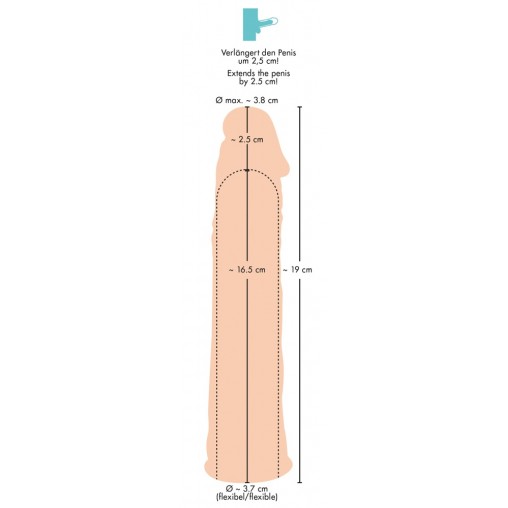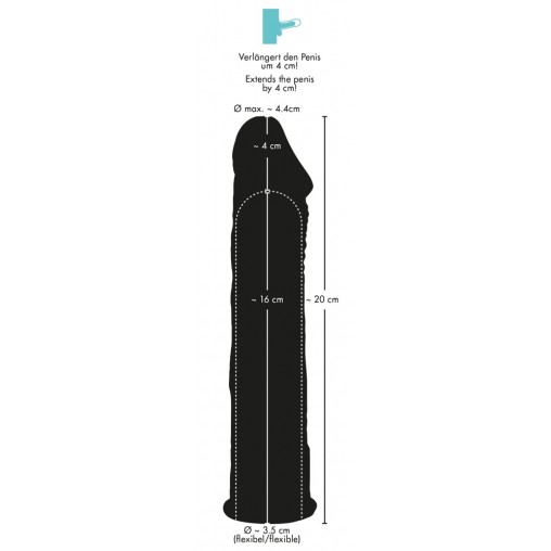 Podaljšek za penis z izbočenimi žilami in glavo penisa mu da realističen videz, obenem pa poveča penis za kar 2,5 cm. Izdelan je iz izjemno mehkega materiala, ki je prilagodljiv in raztegljiv.