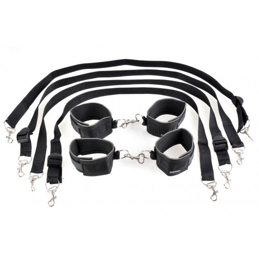 Komplet Cuff & Tether znamke Fetish Fantasy vsebuje okove za gležnje in zapestja ter 4 močne trakove, ki jih lahko uporabite za privezovanje na posteljo ali kateri koli drug kos pohištva.